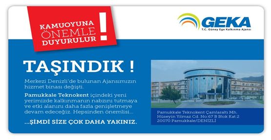 Adres değişikliği nedeniyle, 9 Şubat 2015 tarihinde GEKA tarafından ilan edilen Alternatif Turizm, Üretim ve Ticaret Altyapısının Geliştirilmesi ile Yenilenebilir Enerji alanlarındaki 2015 yılı Mali Destek Programlarına proje başvurusu yapacak paydaşların dosyalarını Ajansın, “Güney Ege Kalkınma Ajansı, Pamukkale Teknokent Çamlaraltı Mh. Hüseyin Yılmaz Cd. No:67 B Blok Kat:2 20070 Pamukkale/DENİZLİ” adresine teslim etmeleri gerektiği açıklandı. Ayrıca yatırım danışmanlığı, yatırım izleme, yatırımcıların idari işlemleri ve bölgeye yatırımcı çekmeğe yönelik çalışmalarını sürdüren GEKA Denizli Yatırım Destek Ofisi de Teknokent Hizmet Binası B Blok giriş katı 8 numaralı odada yatırımcılara hizmet vereceği belirtildi.