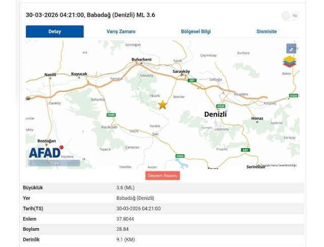 Afet ve Acil Durum Yönetimi Başkanlığından (AFAD) temin edilen verilerine göre, bu sabah saat 04.21 sıralarında merkez üssü Denizli’nin Babadağ ilçesine bağlı kırsal Demirli Mahallesi olan 3.6 büyüklüğünde orta şiddetli bir deprem meydana geldi. Yer kabuğunun 9,1 kilometre derinliğinde meydana gelen deprem Denizli ve Aydın’a bağlı ilçelerden hissedildi.