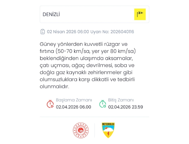 Meteoroloji Genel Müdürlüğü, Denizli'de rüzgarın güney yönlerden kuvvetli ve yer yer fırtına şeklinde (50-70 yer yer 50-80 km/saat) esmesi beklendiğini açıkladı. Meteoroloji, beklenen olumsuz hava şartları nedeniyle ağaç ve direk devrilmesi, çatı uçması, soba ve doğalgaz kaynaklı baca gazı zehirlenmeleri ile ulaşımda aksamalar gibi risklere karşı vatandaşların dikkatli ve tedbirli olunması konusunda uyarıda bulundu. Uyarının 2 Nisan 2026 saat 06.00’da başlayıp aynı gün saat 23.59’a kadar etkili olması bekleniyor.