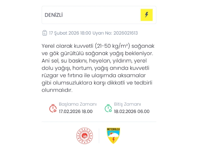Meteoroloji Genel Müdürlüğü, Denizli için kuvvetli sağanak ve gök gürültülü sağanak yağış uyarısında bulundu. Yapılan açıklamaya göre, 17 Şubat 2026 Salı akşam 18.00’dan 18 Şubat Çarşamba sabah 06.00’a kadar Denizli genelinde aralıklı ve yerel olarak kuvvetli sağanak ve gök gürültülü sağanak yağış bekleniyor. Meteoroloji, beklenen kuvvetli yağışlarla birlikte sel ve su baskını, yıldırım, ulaşımda aksamalar, yağış anında kuvvetli rüzgar ve yerel dolu yağışı gibi olumsuzluklara karşı vatandaşların dikkatli ve tedbirli olmaları gerektiğini bildirdi. Ayrıca yaşanabilecek olumsuzluklara karşı gerekli önlemlerin alınması konusunda uyarıda bulundu.